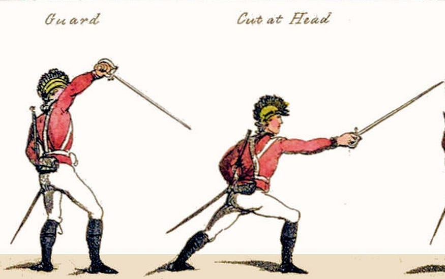 該教範的內容原本是英國皇家劍術大師老亨利.安傑羅,為了訓練倫敦與威斯敏斯特志願輕騎兵,找來蘇格蘭闊劍大師約翰.泰勒,編寫的新兵教範,因此在刊印教範推廣給不同部隊時,教範插圖畫的都是志願輕騎兵的樣子。