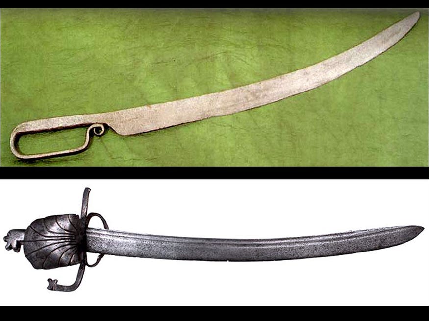 德式長刀是在中世紀德語區非常受歡迎的兵器,其型式多樣,其中不少有側釘設計。甚至有一些文獻資料指出,在中世紀晚期到文藝復興的時代幾乎每個德國的男性農夫,他們都會攜帶這種刀出門。